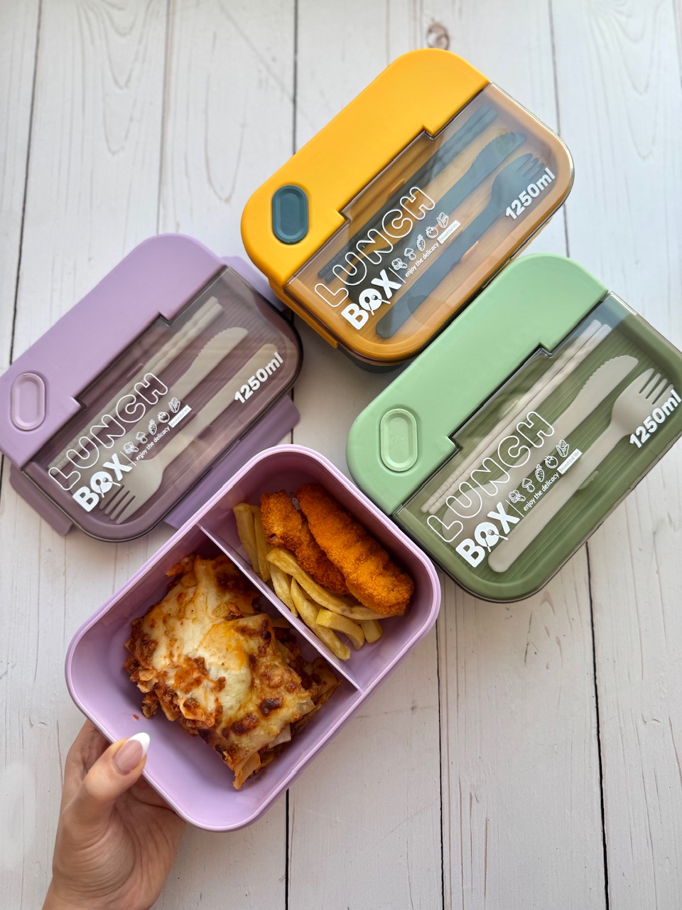 لانچ باکس وارداتی مستطیلی🍱 -ظرف غذای دوقسمتی جهت جداسازی برنج و خورشت -به همراه قاشق و چنگال و چاقو و چاپ استیک -واشر دار و بدون نشتی -قابل استفاده در ماکروفر -گنجایش ۱۲۵۰ میلی لیتر -ابعاد: ۸*۱۴*۲۰ سانتیمتر -رنگبندی : سبز، سورمه ای، بنفش